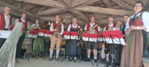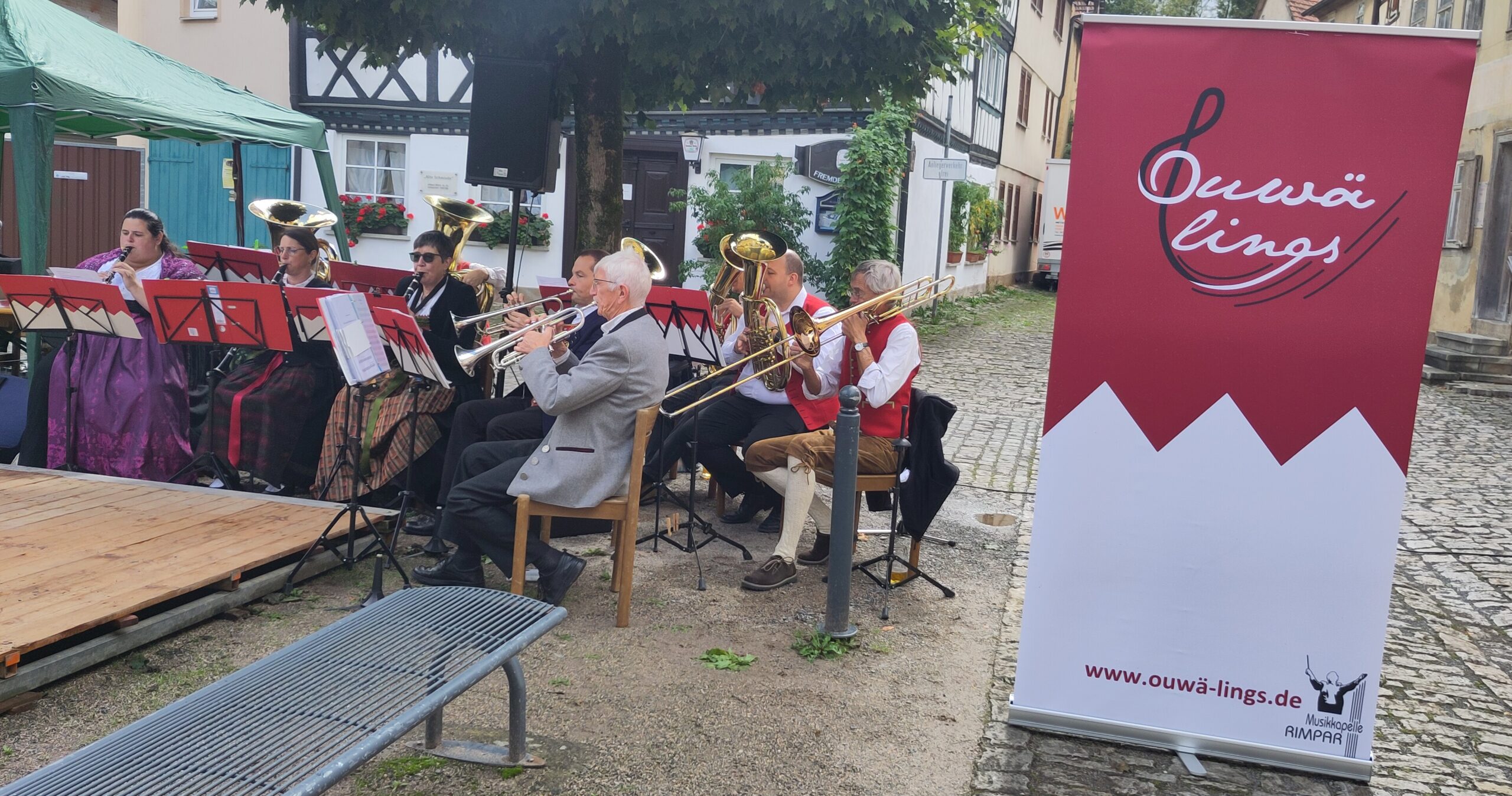 Die Fränkischgruppe Ouwä Lings des Rimparer Musikvereins spielte zum ersten Mal beim Fränkischen Volksmusikfest im Freilandmuseum Bad Windsheim. Hier sind jedes Jahr die bekanntesten Ensembles aus der Region vertreten. In allen Museumshäusern wird gesungen, gespielt und getanzt. Die Ouwä-lings-Musiker hatten Glück und spielten im Schatten unter einer mitelalterlichen Holzkonstruktion drei Stunden flotte Walzer, Schottisch, Rheinländer und Dreher, doch die große Hitze lockte nur vereinzelte Paare auf die sonnenbeschienene Tanzfläche. Die zahlreichen Zuhörer im nahen Biergarten spendeten dafür reichlich Applaus.